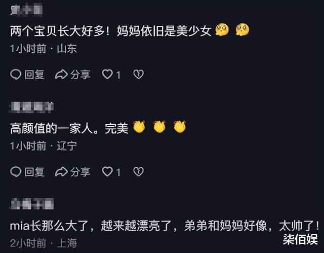 姐姐米雅像爸爸,弟弟爱登则更像妈妈,混血感没有那么强。马雅舒与儿子贴脸合照,10岁儿子长得清秀帅气,和妈妈马雅舒十分相似。